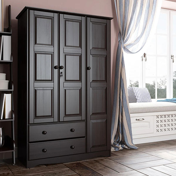 Our Grand Wardrobe is the best all-in-one solution! Your needs to hang, to store, to shelve and to lock it securely will be satisfied in this one solid wood package. It's not only very functional, it is aesthetically pleasing as well. Only solid wood can offer a silky smooth finish, beveled edges and knobs turned on a lathe. Optional large shelves will expand its storage capacity even further if needed. Available in 3 popular colors it will match most interiors.