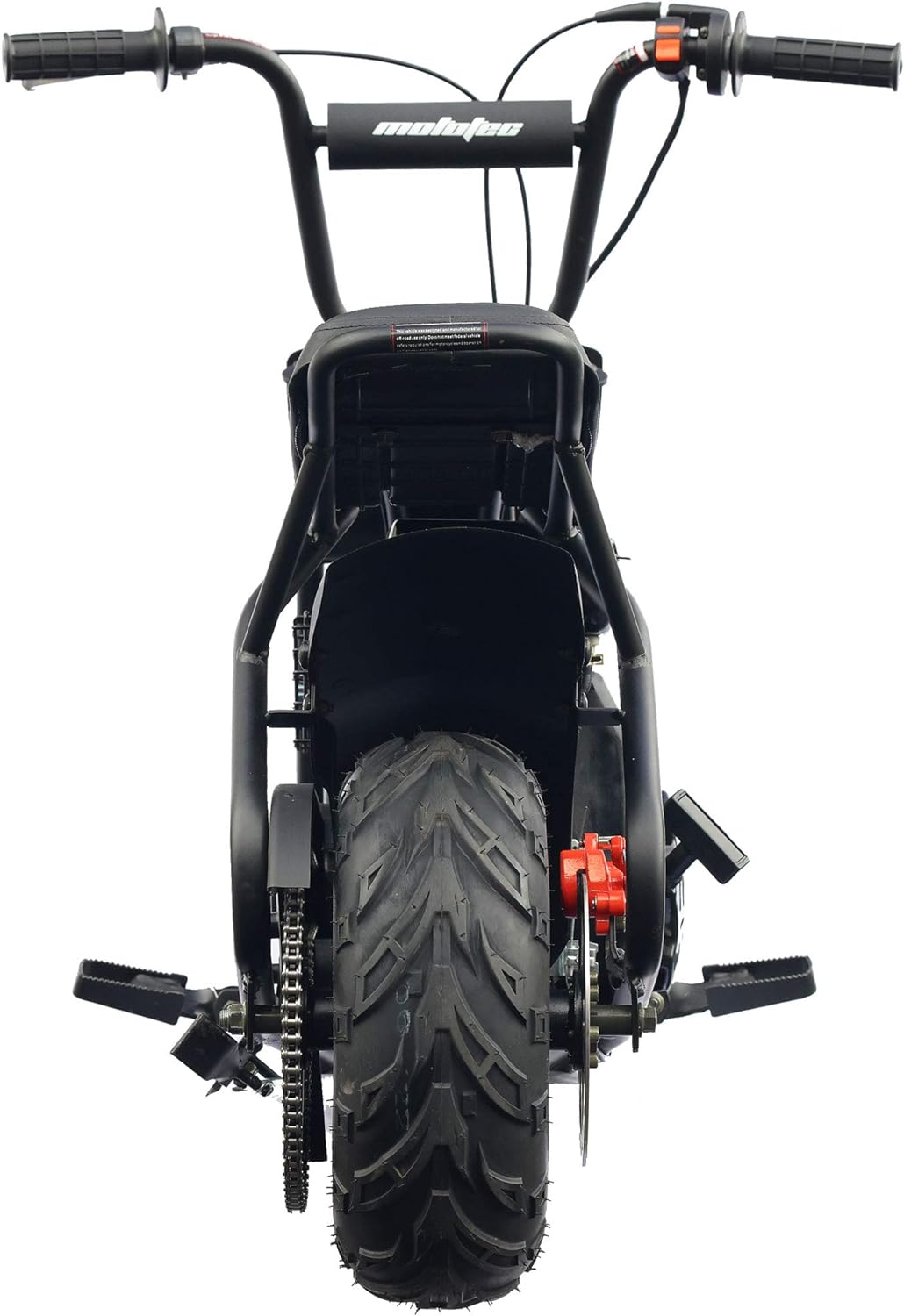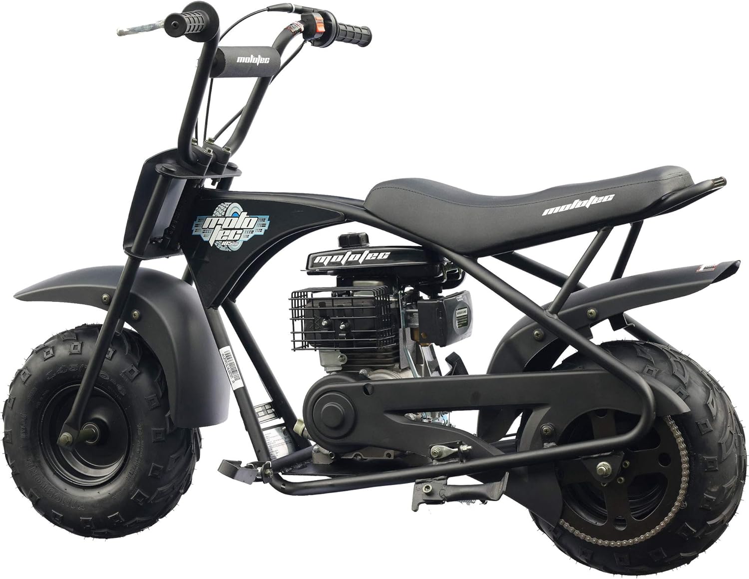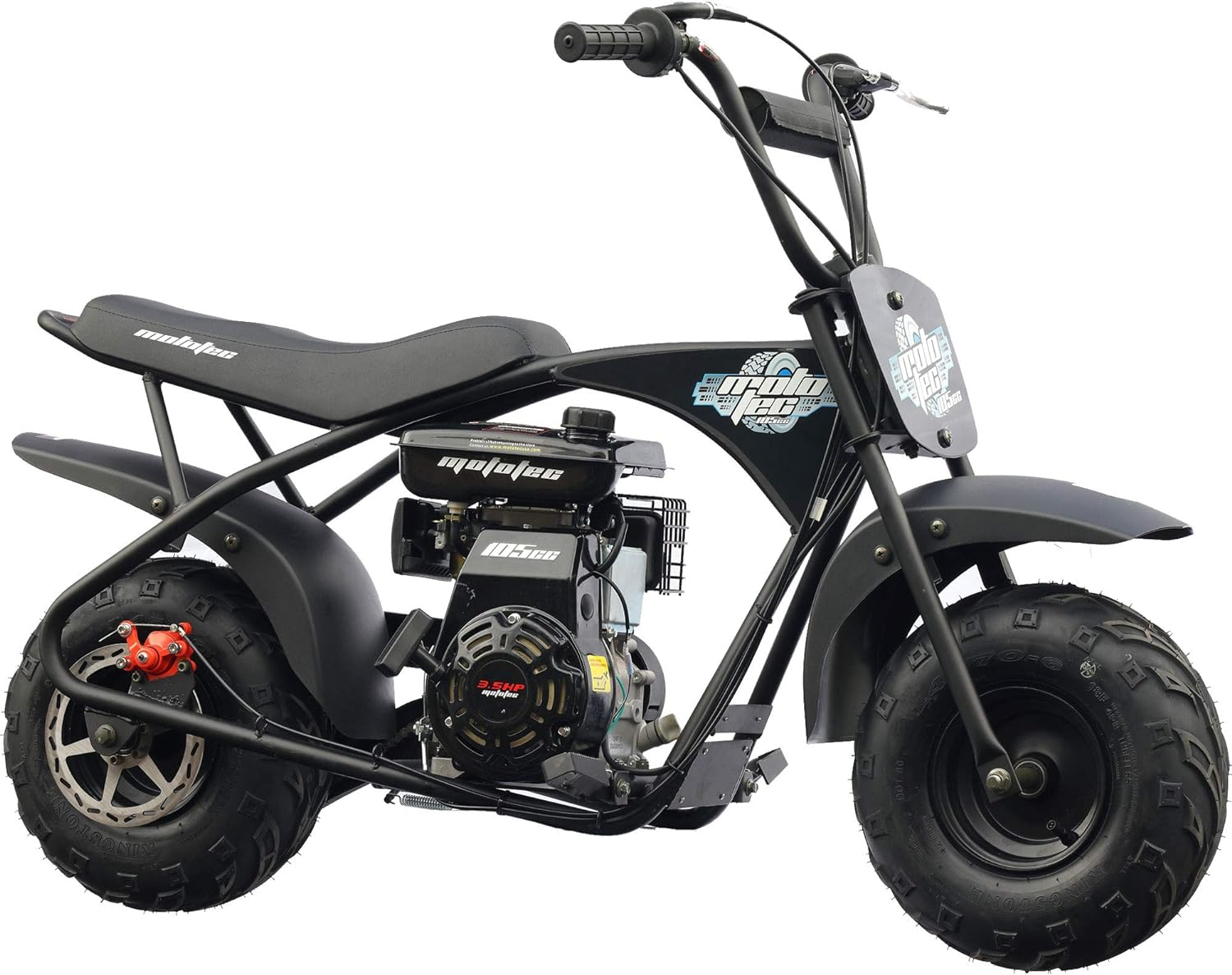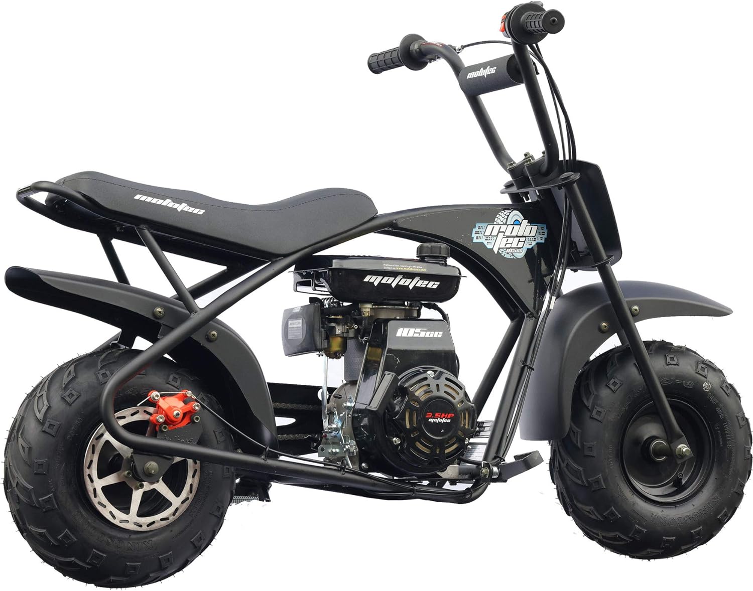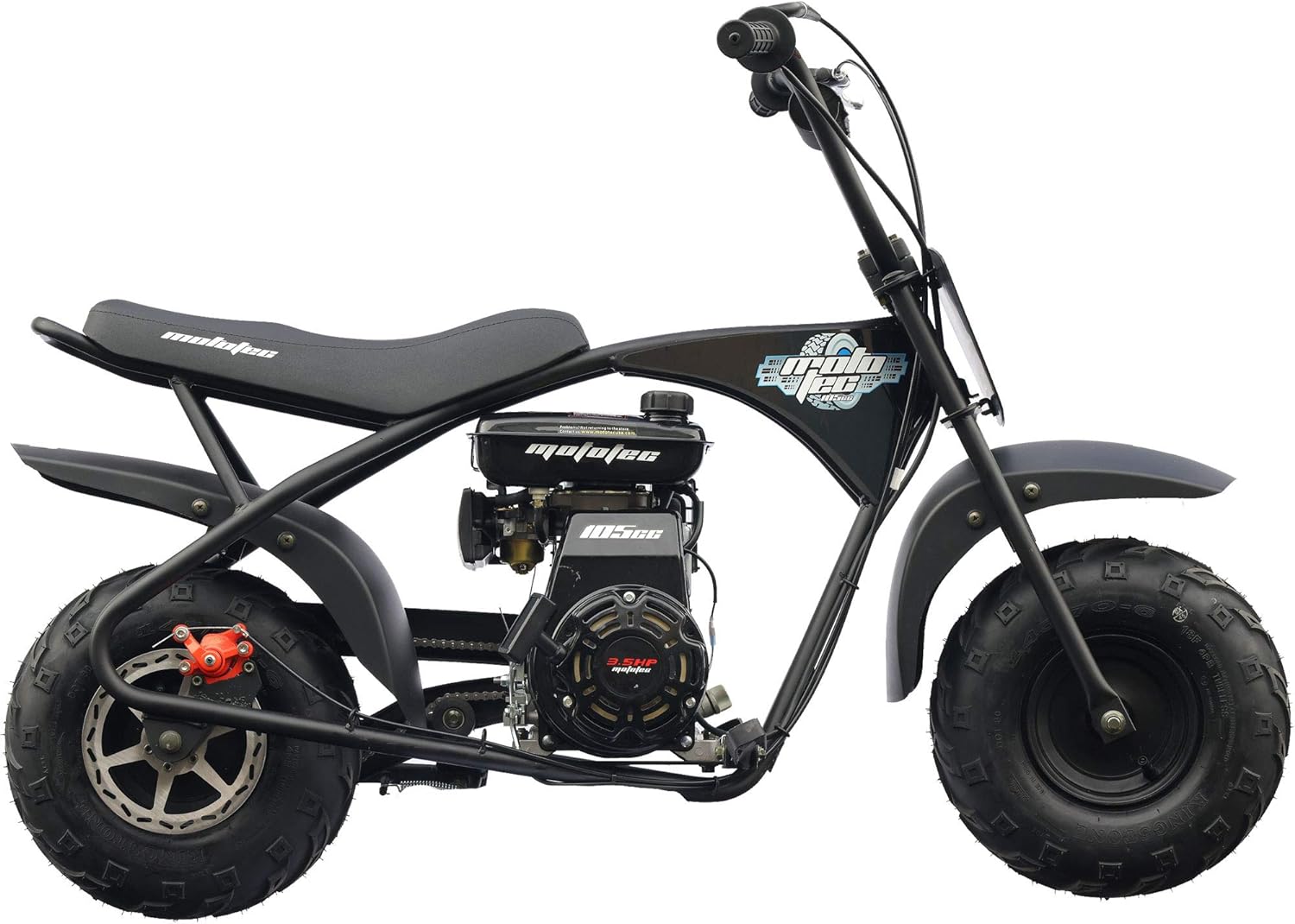 Introducing the MotoTec 105CC 3.5HP Mini Bike! Just like the ones your parents used to drive, only safer and easier to use. Powered by a 105cc 3.5HP overhead valve 4-stroke engine(no need to mix gas and oil) and an automatic clutch to ensure easy operation. With it's rugged steel frame and no-dent fenders, this mini bike is built tough to handle the roughest of terrain. Assembly: Attach the handlebars, add gas and ride. Engine: 105cc/3.5HP Overhead-Valve 4-Stroke (Lifan) Max Speed: 23mph Weight Capacity 185lbs Starter Type: Easy Pull Throttle: Twist Grip Transmission: Automatic, Centrifugal Clutch, Chain Drive (#35, 75 links) Handlebars: Adjustable forward and back Rider Comfort: Large padded seat Wheels: 14.5x7-6 Off Road Tubeless Pneumatic Tires with Steel Rims Brakes: Mechanical Rear Disc Seat Height: 24 inches Wheelbase: 36.5 inches Box Dimensions: 51x15x26 inches Box Weight: 108 lbs Warranty: 60 days parts replacement