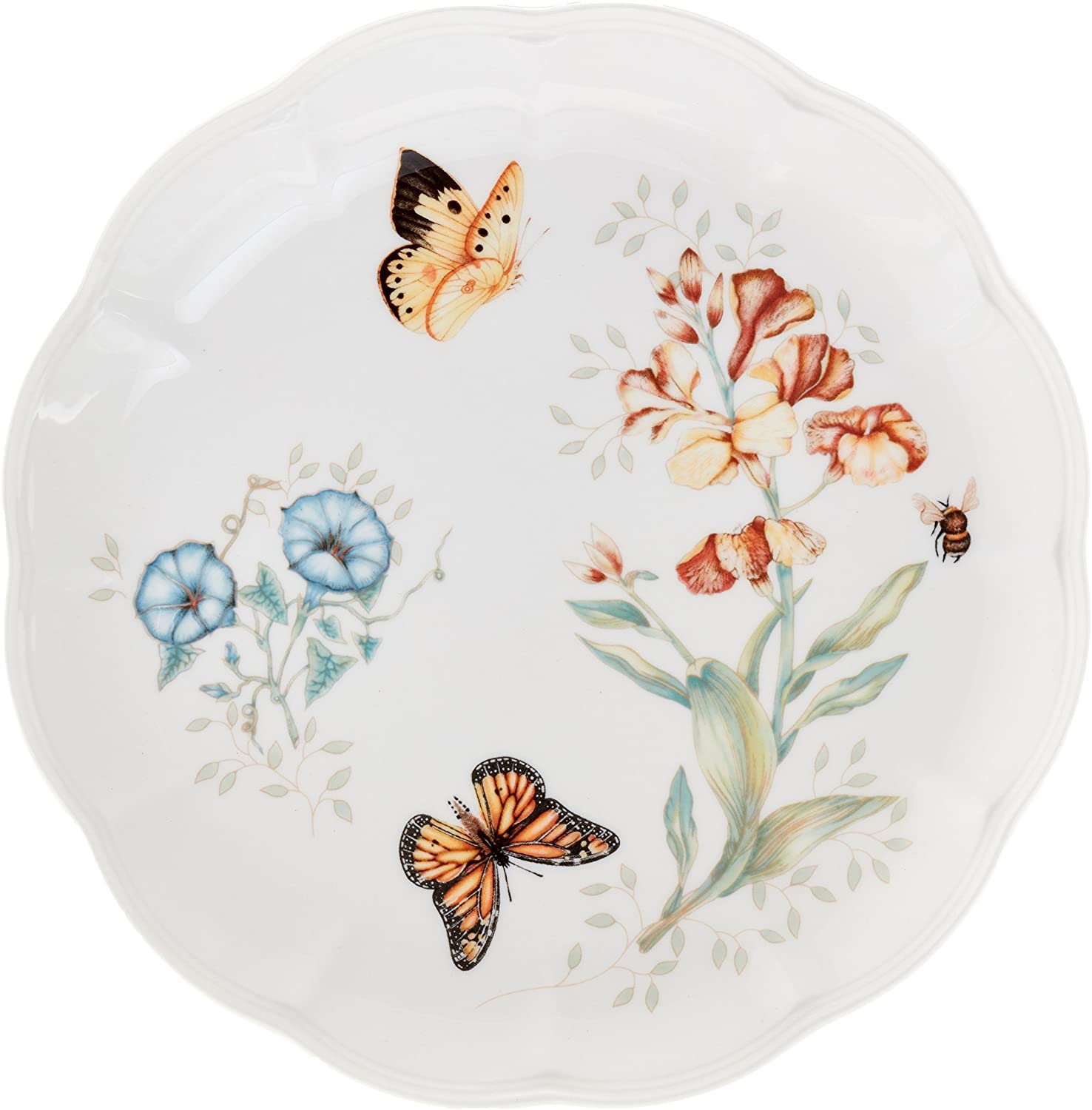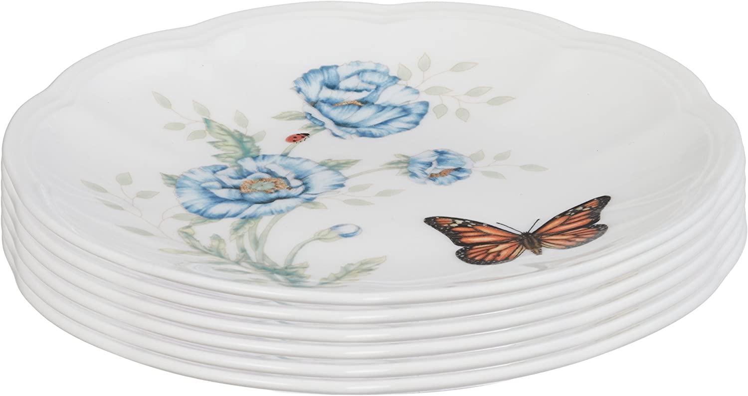 - Florals and butterflies rendered in exquisite colors adorn each scalloped piece