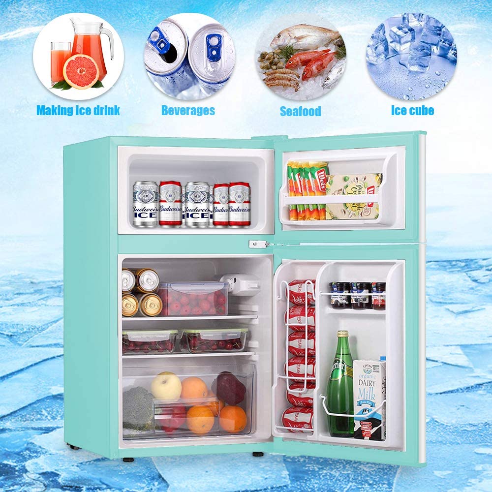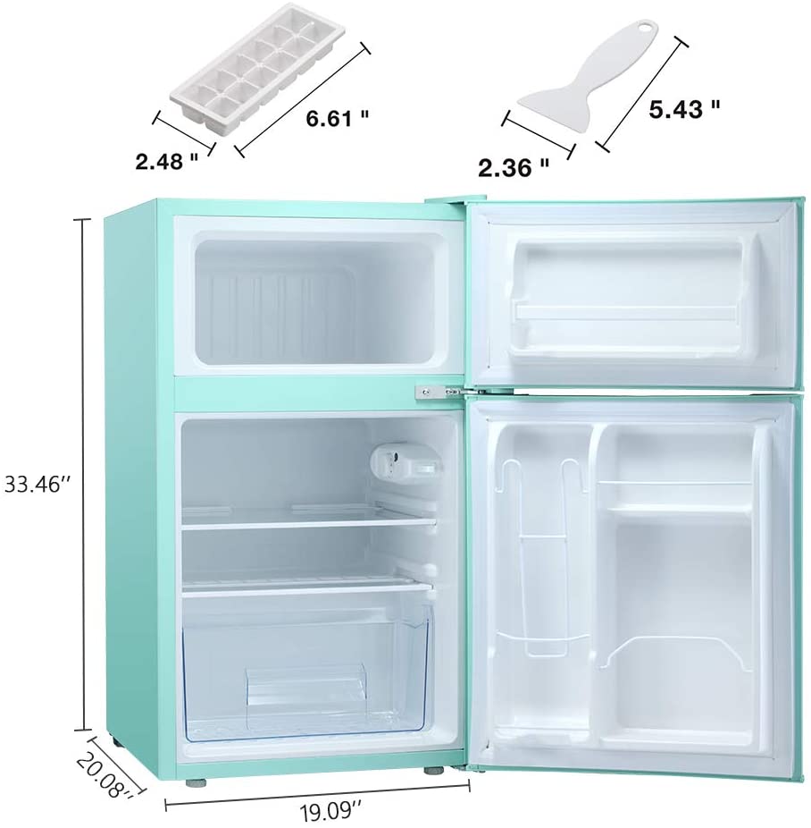 - 【Compact Size & Large Capacity】- The double door electric fridge with 19″(W)x 33.5″ (H)x 20″(D). 0.93 Cu.ft freezer features ample storage space can be used storage your ice cream,meat. And 2.27 Cu.ft fridge area with fruit and vegetable drawer Separately,can keep fruits and vegetables fresh longer. The inside of the door with racks (which prevent from falling)also can store food,you can place bottles and cans.More spacious than usual mini-fridge.