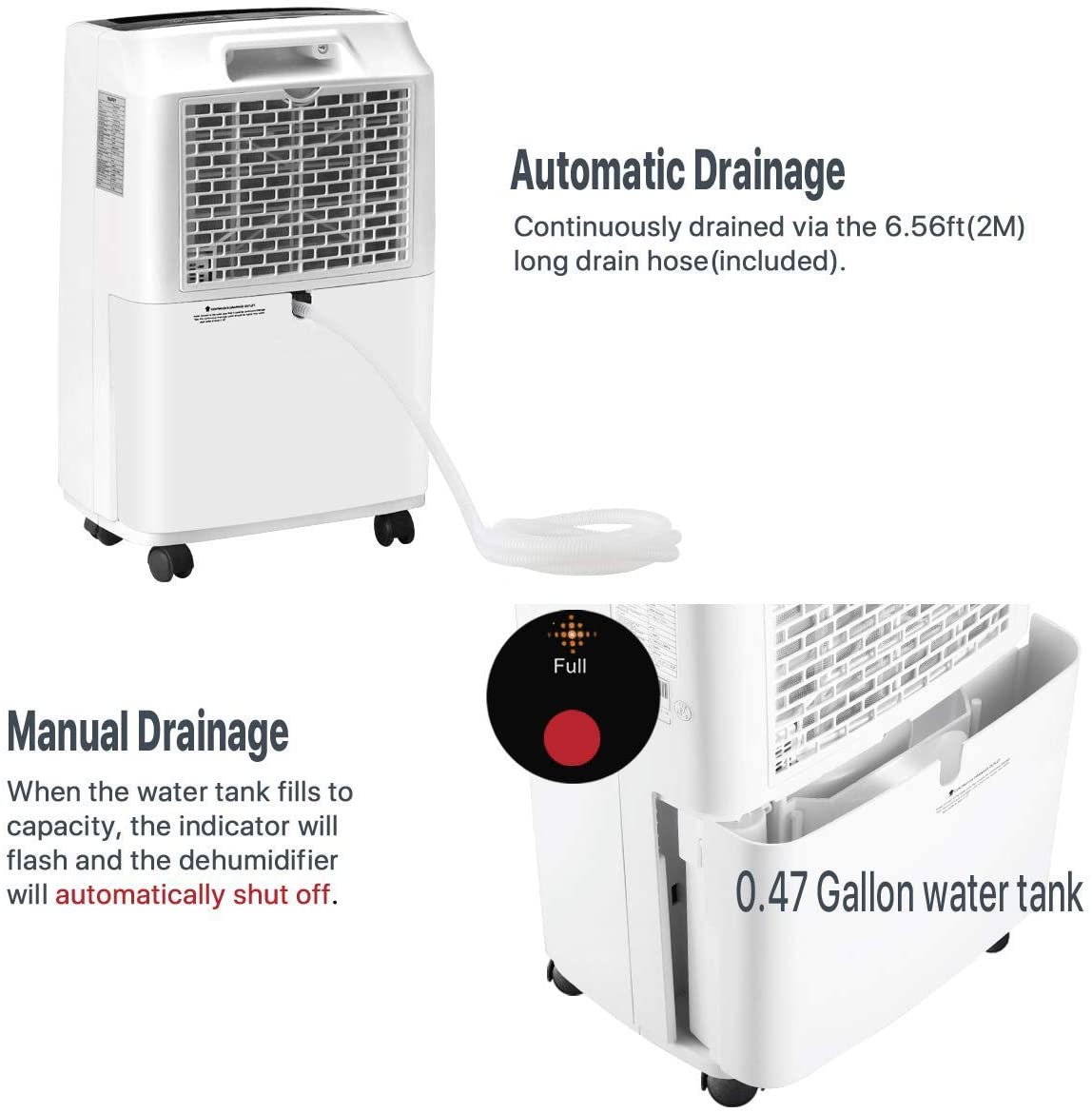 EASY TO MOVE AND CARRY. Many mini dehumidifiers are portable but the dehumidification capacity is not ideal, however, many dehumidifiers with better capacity are clunky and hard to move. We took this into full consideration when designing. The convenient built-in wheels and handles make our dehumidifier so easy to move from one room to another. It guarantees efficient dehumidification while being as easy to carry as many mini dehumidifiers. So good!