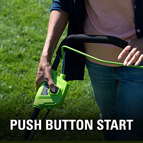 - Push-button start — no gas, no oil, no pull cord