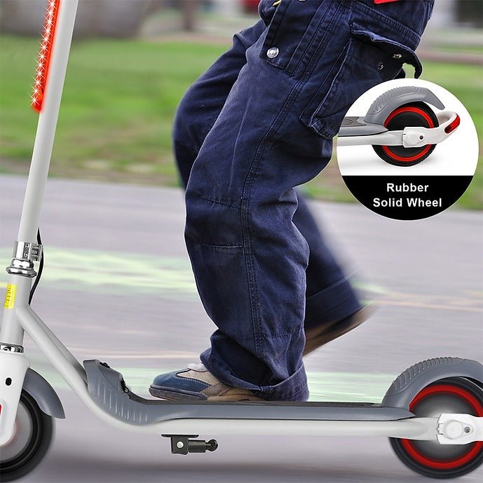 Additionally, our kids electric scooter is wear-resistant, anti-slip and shock-absorbing as it has 6.5" rubber solid tires so it can move freely on all terrains. Besides, this electric scooter for kids features a super bright LED headlight that allows you to travel safely even at night.