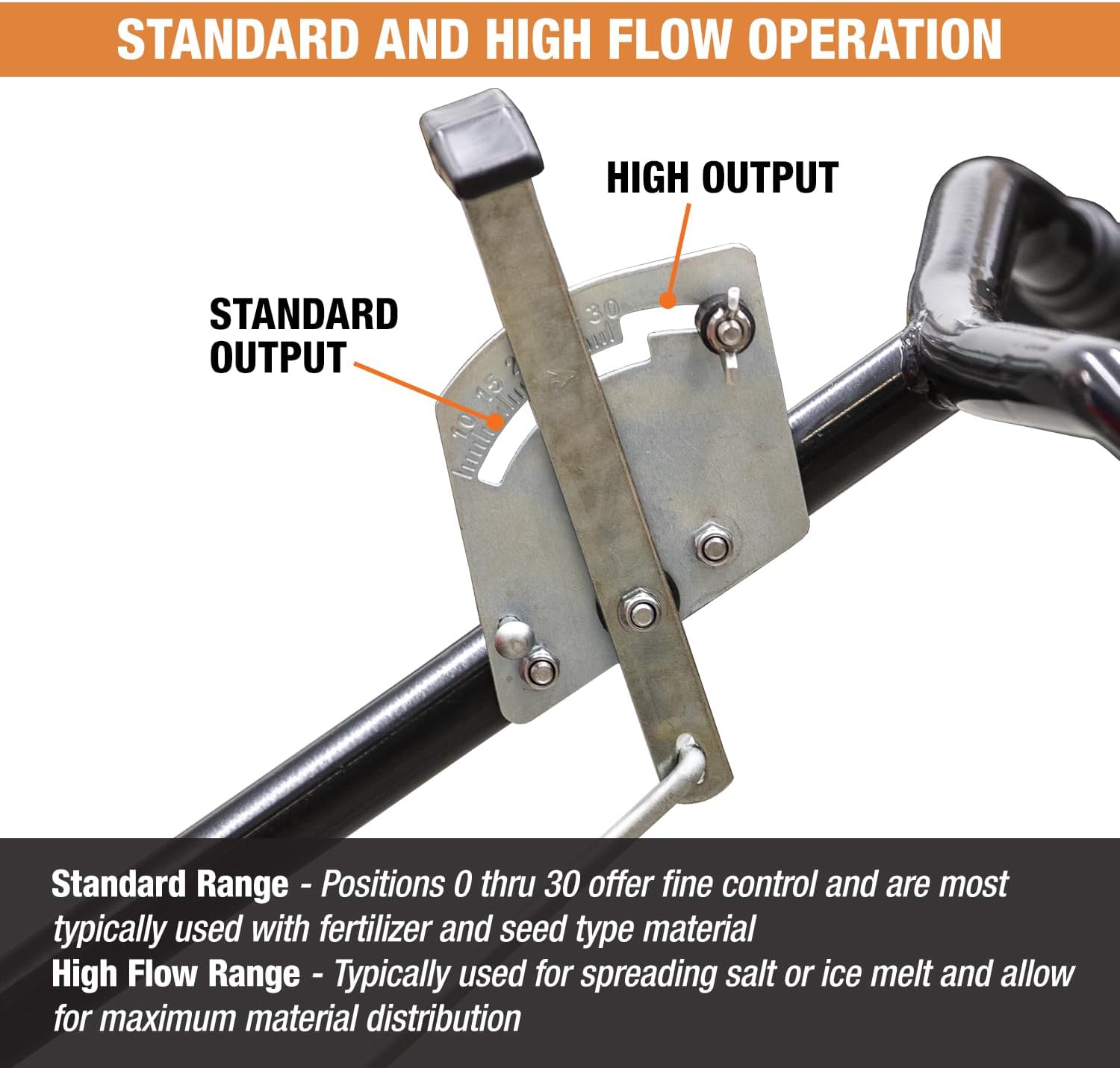 Precision control with Grounds Keeper broadcast spreader's output gauge. Our standard range provides fine control and high-flow options, ensuring efficient and tailored spreading for your needs. Easily, adjustable when you need it