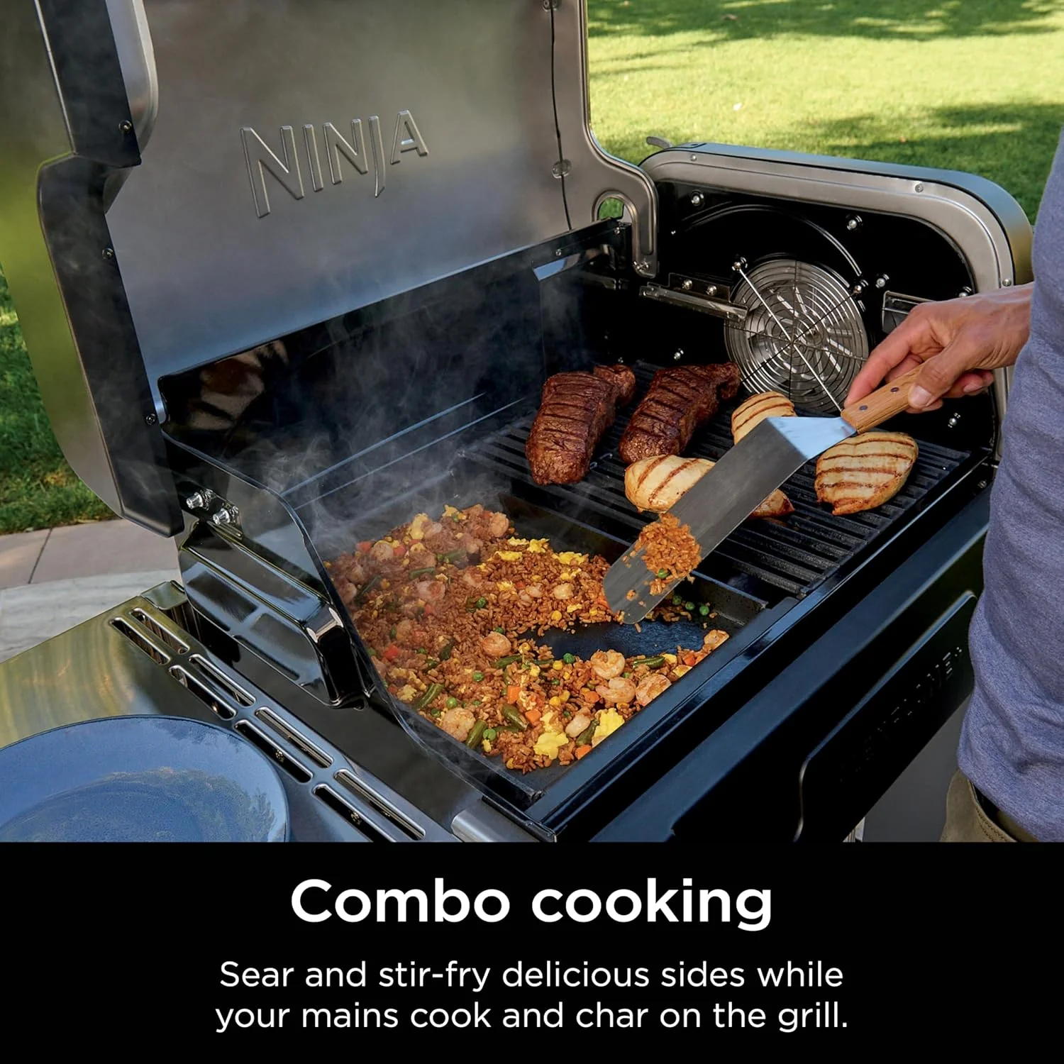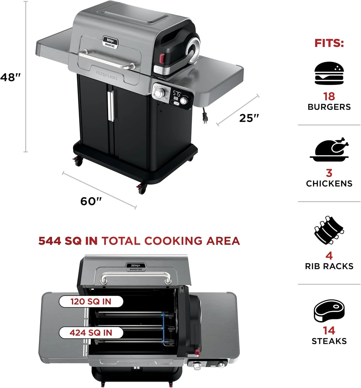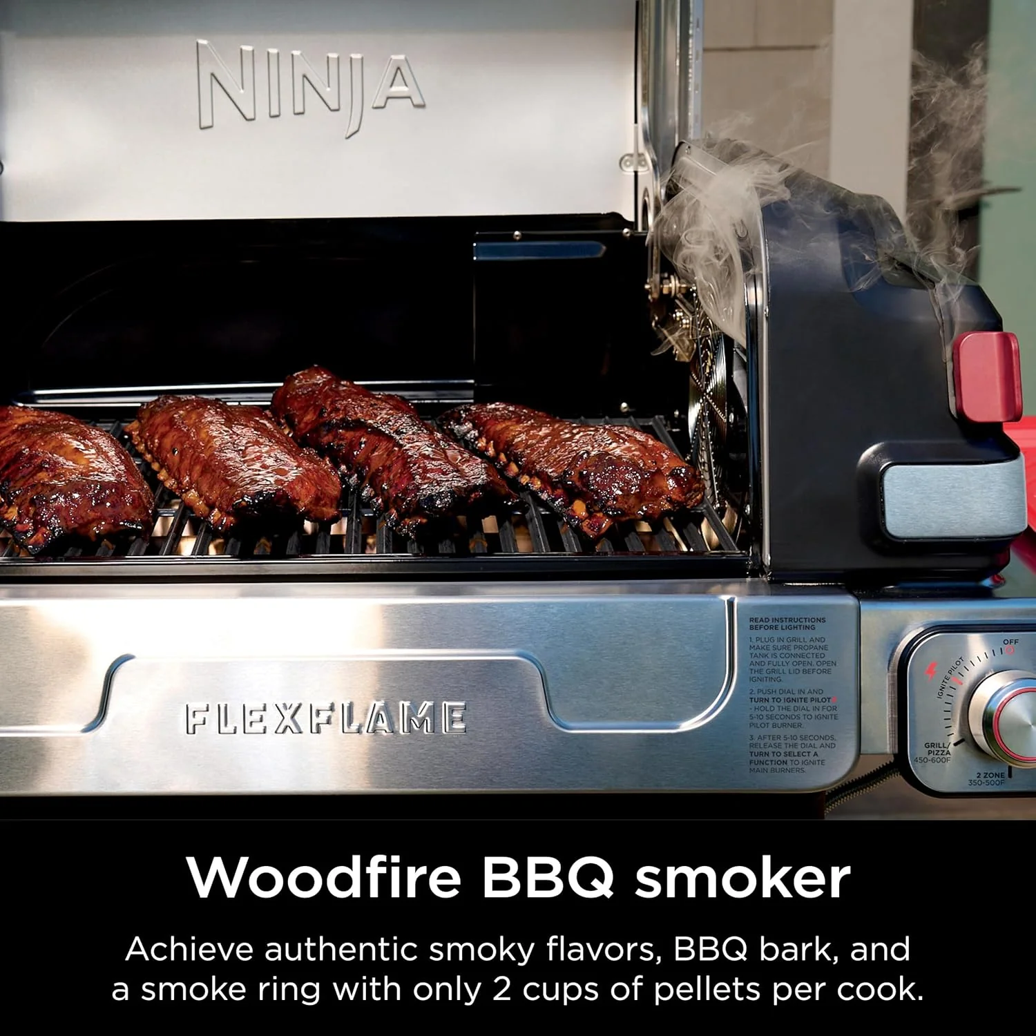 • Ninja FlexFlame, Grill and Smoker, Electric and Propane Grill, Roaster, BBQ Grill, 5-in-1 Cooking System, 3 Burner, Digital Control, Outdoor Cooking, Griddle, Pizza Maker, Stainless Steel, PG301