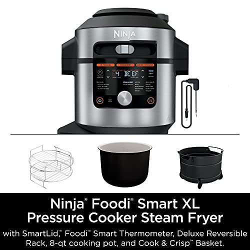 • Ninja OL701 Foodi 14 in 1 SMART XL 8 Qt. Pressure Cooker Steam Fryer with SmartLid & Thermometer Auto Steam Release, that Air Fries, Proofs & More, 3 Layer Capacity, 5 Qt. Crisp Basket, Silver/Black