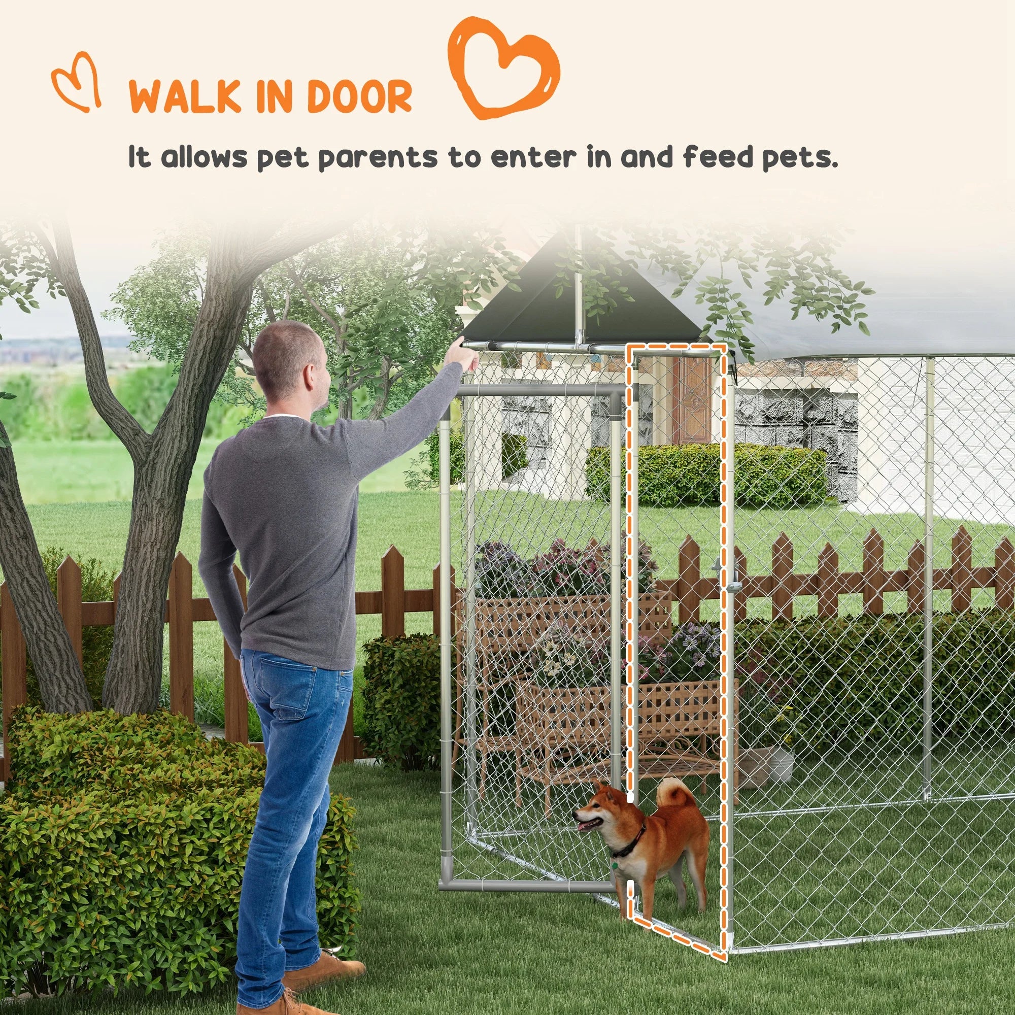 Out of the Sun: This outside dog kennel offers your dog a homier space to stay. We chose Oxford cloth fabric for water and UV resistance. The roof with spring button clips helps pups stay cool in the heat while helping to prevent dehydration. Quality Steel: We made sure that there will be no sharp edges that could hurt your pets. The solid galvanized steel railings are strong and sprayed for a better-quality surface. Large Dog Kennel: This chain link dog kennel provides a roomy space with 149 ft² for your furry friends to relax without feeling bound. It's suitable for all breed-sized dogs, such as beagles, dalmatians, and rottweilers. Easy Access: This dog kennel has a walk-in door, which makes it easy for your fur baby to enter and exit. The lockable design shields your puppies from potentially hazardous situations when you can't watch over them. Outdoor Dog Kennel with Roof Info: Overall Dimensions: 19.7' L x 7.5' W x 7.5' H. Eaves height: 6' H. Assembly required. Specifications: Materials: Galvanized Steel, Oxford Fabric Overall Size: 19.7' L x 7.5' W x 7.5' H Eaves Height: 6' H Cover Size: 8.4' L x 19.7' W Area: 149 ft² Door: 21.7" W x 65" H Mesh Size: 2.6" L x 2.6" W Item Label: D02-179V02SR Note: Installation Instructions: After assembling the frame, use cable ties to fasten the mesh netting, then use steel wire to reinforce and securely fasten each section