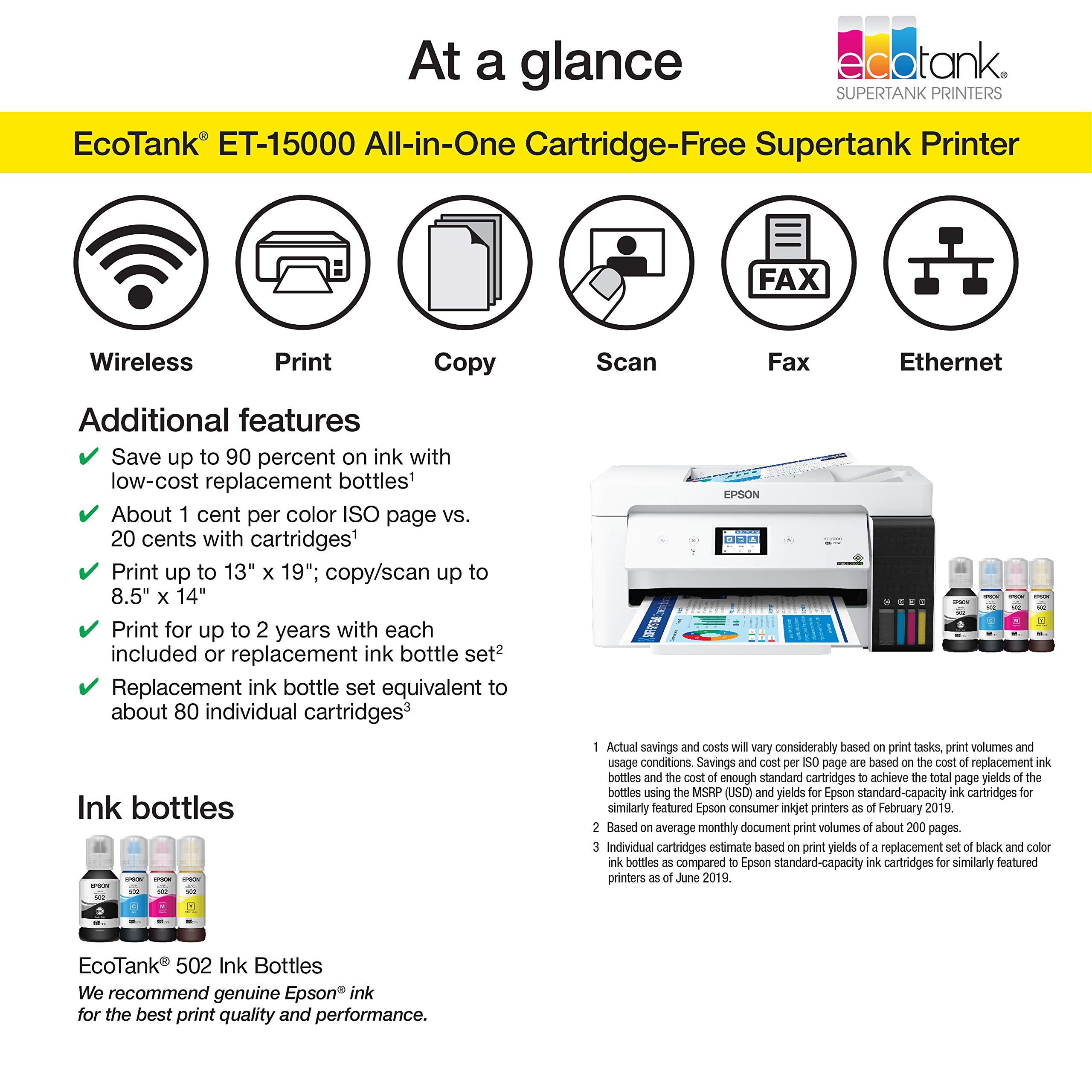 Print for up to 2 years with each included or replacement ink bottle set (2) — each set includes enough ink to print up to 7,500 pages black / 6,000 color (3); you could save 620 dollars with each one (1).