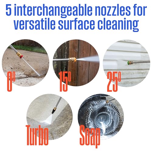 • Easy-Coil Nylon-Braided 25' hose - 20 oz (600 mL) Onboard Soap Tank to Add Detergents/Chemicals for Heavy-Duty Cleaning Power on Decks, Driveways, Garage Floors, Stairs, Fencing, Patio Furniture, and Vehicles