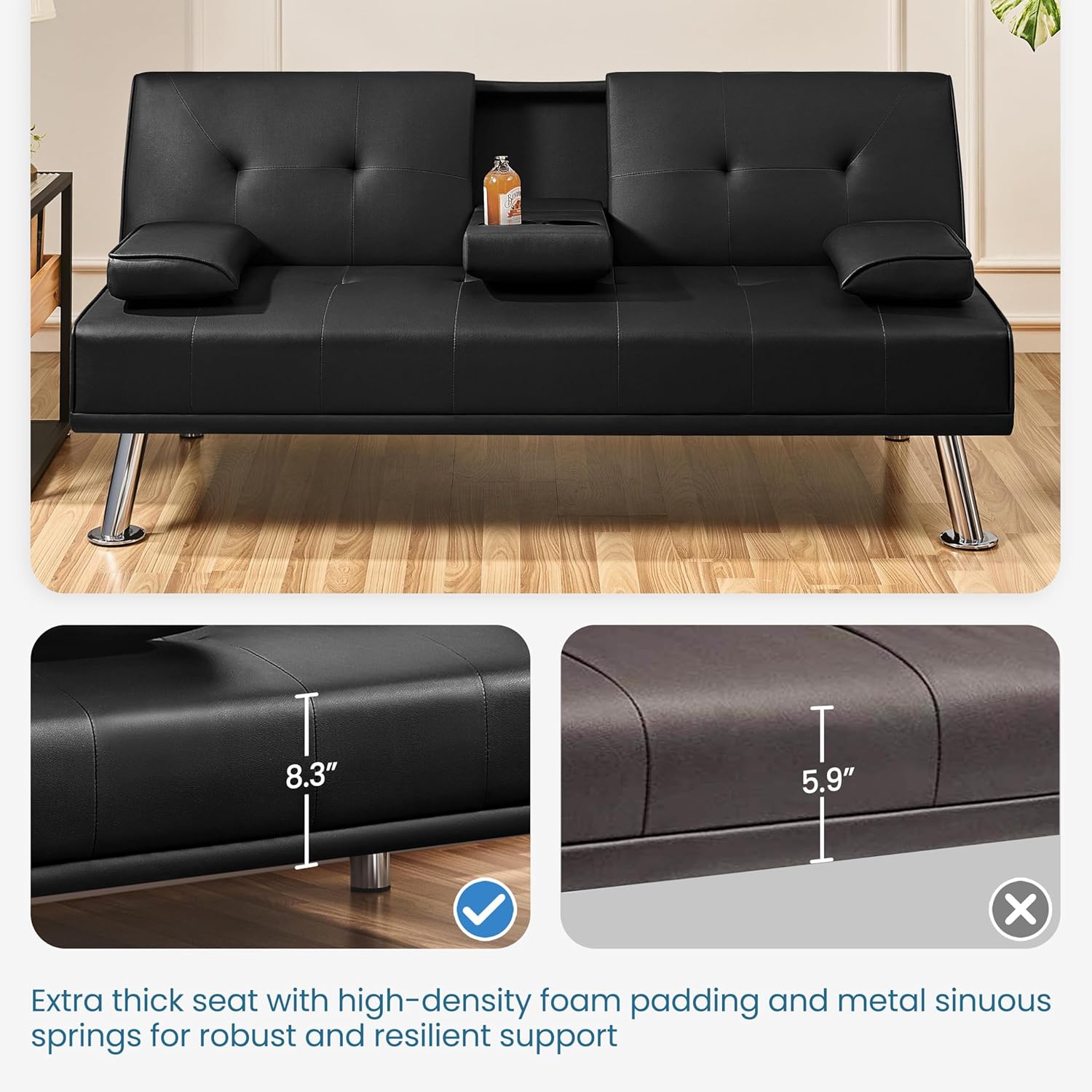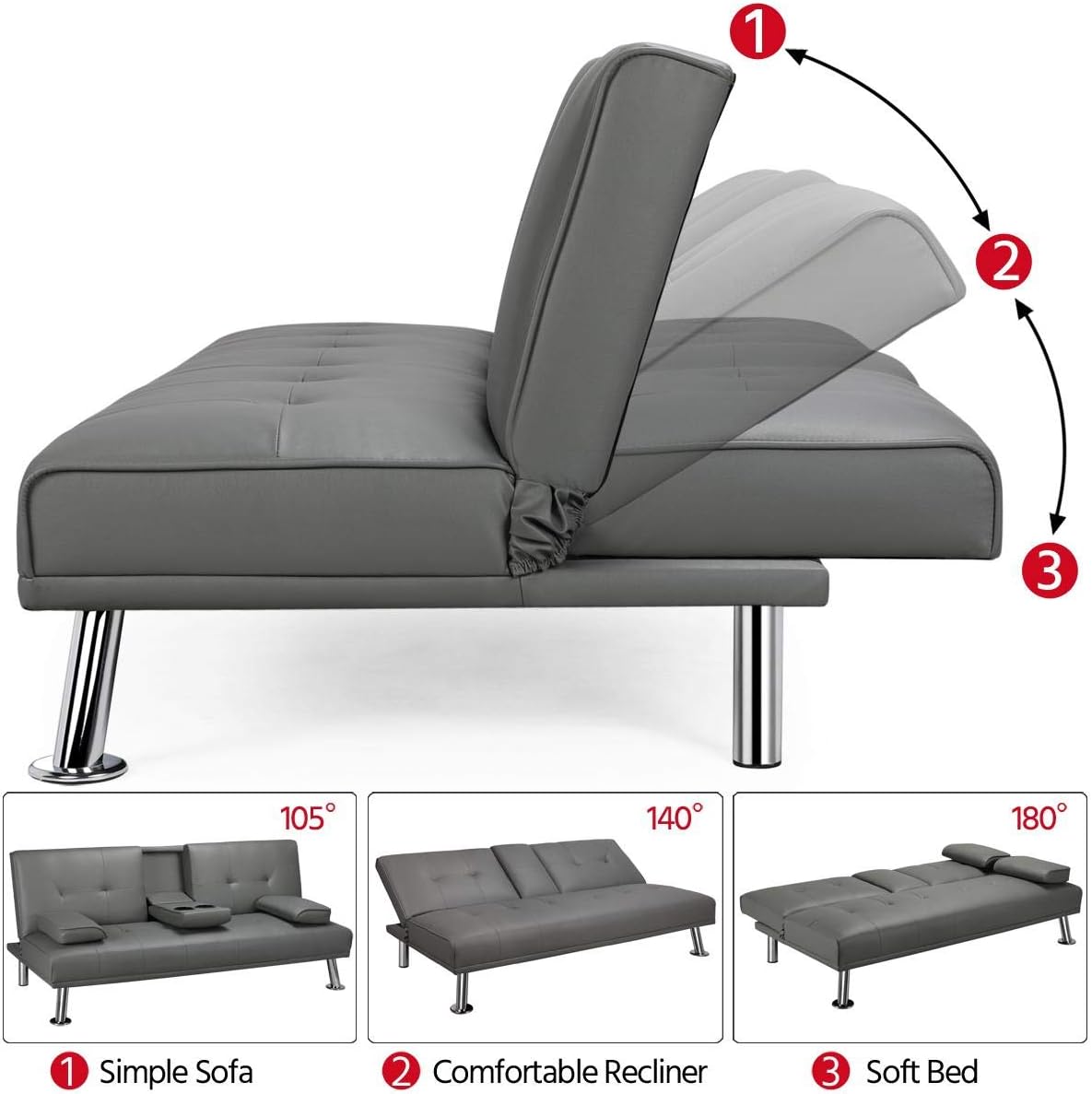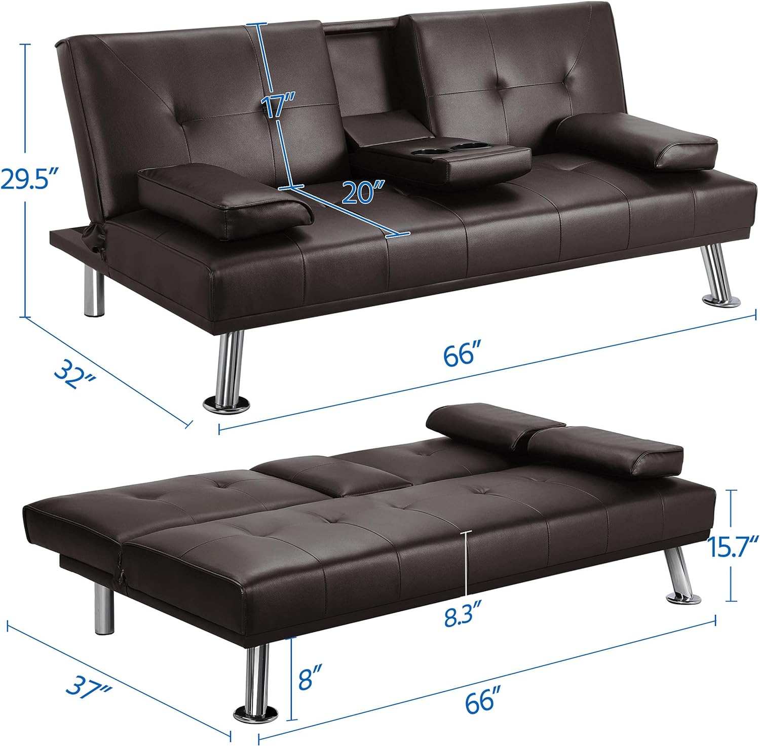 - 【THOUGHTFUL DESIGN】: The leather sofa bed is well designed for entertainment. The middle armrest folds down with 2 cup holders, so you and your friend can relax and enjoy a couple of beverages.